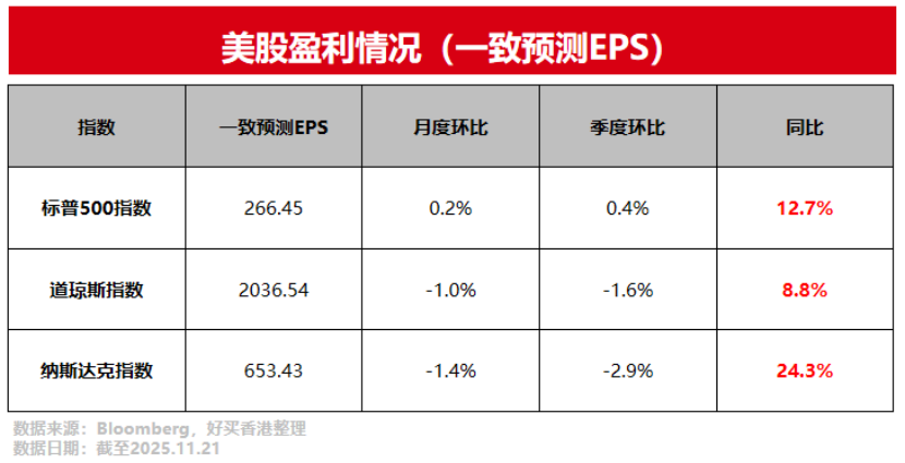 再看美股整體的盈利情況,截至11月21日,納斯達(dá)克指數(shù)的一致預(yù)測(cè)EPS仍保持24.3%的同比增速,顯示出美國科技股強(qiáng)勁的盈利增長。